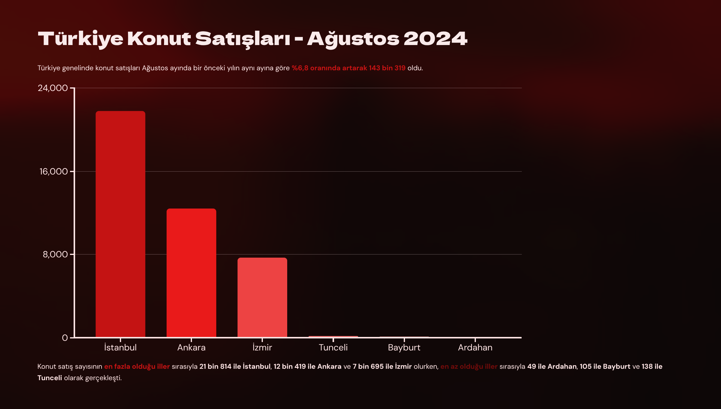Türkiye genelinde konut satışları Ağustos ayında bir önceki yılın aynı ayına göre %6,8 oranında artarak 143 bin 319 oldu. Konut satış sayısının en fazla olduğu iller sırasıyla 21 bin 814 ile İstanbul, 12 bin 419 ile Ankara ve 7 bin 695 ile İzmir olurken, en az olduğu iller sırasıyla 49 ile Ardahan, 105 ile Bayburt ve 138 ile Tunceli olarak gerçekleşti.